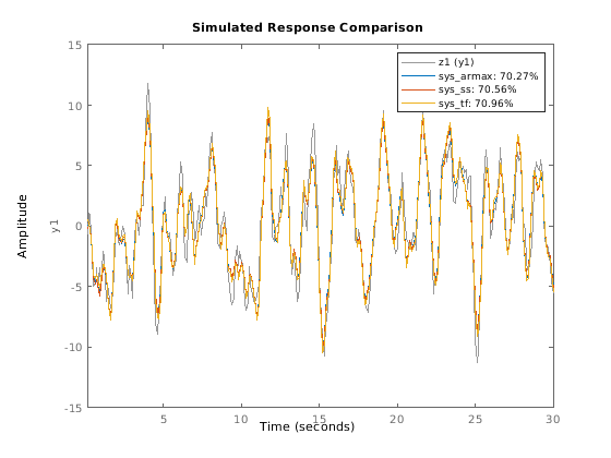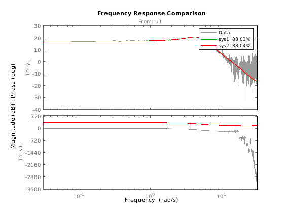 Результат подгонки NRMSE вы получаете с compare может не точно совпадать с подходящим значением, о котором сообщают в идентификации модели. Эти различия обычно являются результатом несоответствий в начальных условиях, и в различиях в значениях по умолчанию горизонта предсказания для идентификации и для валидации. Различия обычно малы и не должны влиять на ваш рабочий процесс выбора и валидации модели. Для получения дополнительной информации смотрите Различия в Значении Подгонки Твердости Между Идентификацией Модели и сравните Команду.