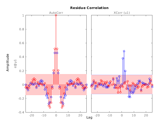 Для данных временного интервала, resid строит автокорреляцию остаточных значений и взаимную корреляцию остаточных значений с входными сигналами. Корреляции сгенерированы для задержек-25 к 25. Чтобы задать различное максимальное значение задержки, использовать residOptions. 99%-я область доверия, отмечающая статистически незначительные корреляции, отображается как теневая область вокруг Оси X.