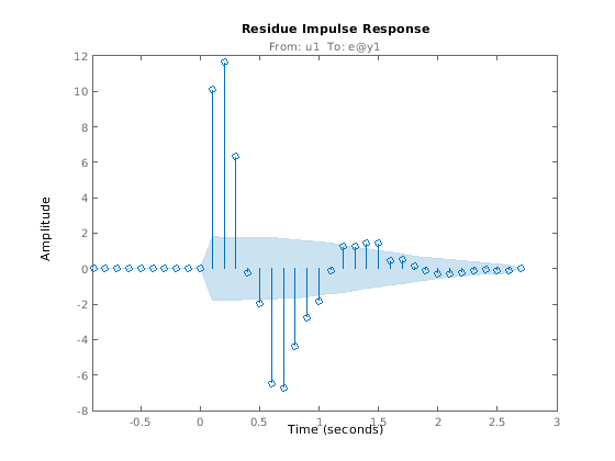 Для данных частотной области, resid строит диаграмму Боде частотной характеристики от входных сигналов до остаточных значений. 99%-я область доверия, отмечающая статистически незначительный ответ, показывается областью вокруг Оси X.