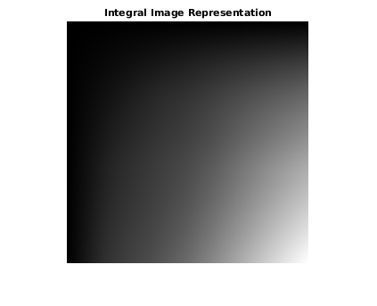 Вычислите интегральное представление изображений заполненного изображения с помощью integralImage функция и отображение это. Интегральное изображение монотонно не уменьшается слева направо и от начала до конца. Каждый пиксель представляет сумму всех интенсивностей пикселей к верхней части и оставленный текущего пикселя в изображении.