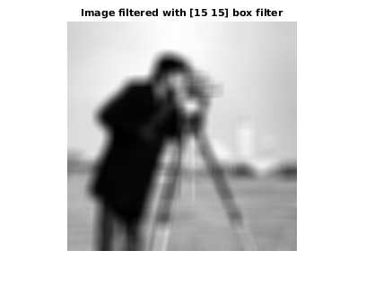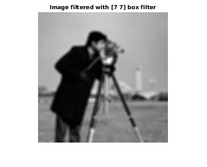 extraPadding1 = (maxFilterSize - filterSizes(1,:))/2; filteredImage1 = filteredImage1(1+extraPadding1(1):end-extraPadding1(1),... 1+extraPadding1(2):end-extraPadding1(2) ); extraPadding2 = (maxFilterSize - filterSizes(2,:))/2; filteredImage2 = filteredImage2(1+extraPadding2(1):end-extraPadding2(1),... 1+extraPadding2(2):end-extraPadding2(2) ); figure imshow(filteredImage1,[]) title('Image filtered with [7 7] box filter')