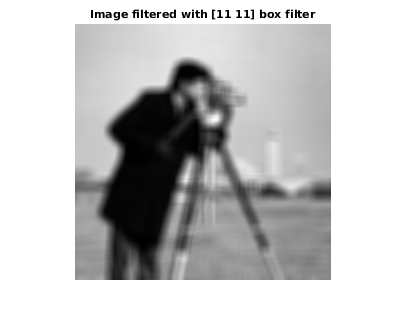 title('Image filtered with [11 11] box filter')![Figure contains an axes object. The axes object with title Image filtered with [11 11] box filter contains an object of type image.](../examples/images/win64/ApplyMultipleFiltersToIntegralImageExample_04.png)