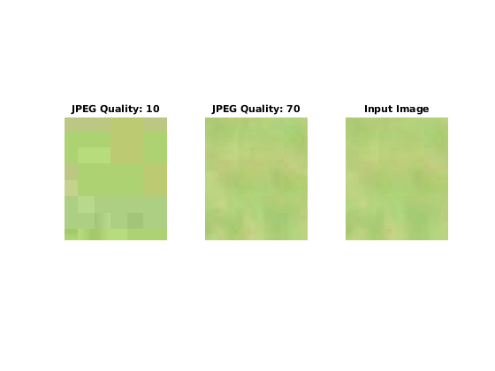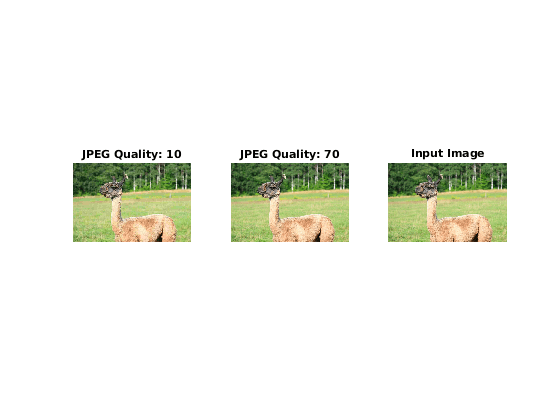 jpegQuality = 10:10:100; numObservations = numel(jpegQuality); compressedFrames = cell(1,numObservations); for ind = 1:numObservations q = jpegQuality(ind); tempFile = ['llama_compression_',num2str(q),'.jpg']; imwrite(im,tempFile,'Quality',q); compressedFrames{ind} = imread(tempFile); end