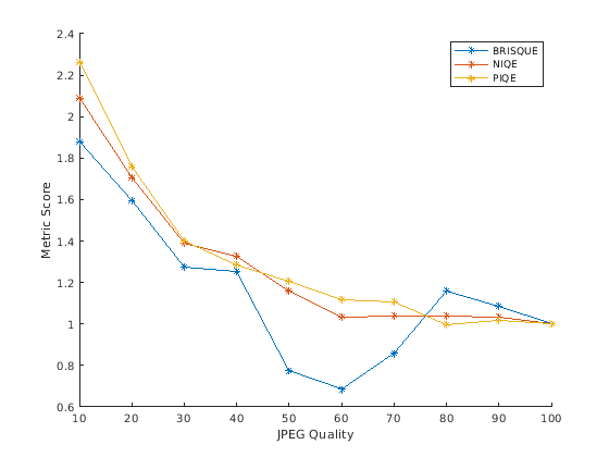 figure hold on plot(jpegQuality,bQ/bQ(end),'*-'); plot(jpegQuality,nQ/nQ(end),'*-'); plot(jpegQuality,pQ/pQ(end),'*-'); legend('BRISQUE','NIQE','PIQE'); ylabel('Metric Score') xlabel('JPEG Quality') hold off