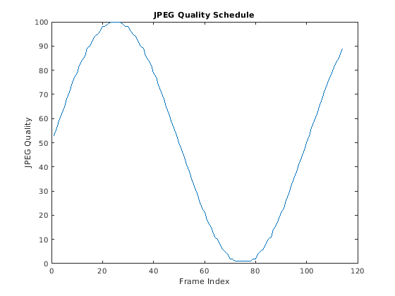 numFrames = vidObjR.NumFrames; varyingQuality = sin(2*pi*(1:numFrames)*0.01); varyingQuality = round(rescale(varyingQuality)*100); varyingQuality = max(varyingQuality,1); % min JPEG quality is 1 figure plot(varyingQuality); title('JPEG Quality Schedule'); ylabel('JPEG Quality') xlabel('Frame Index')