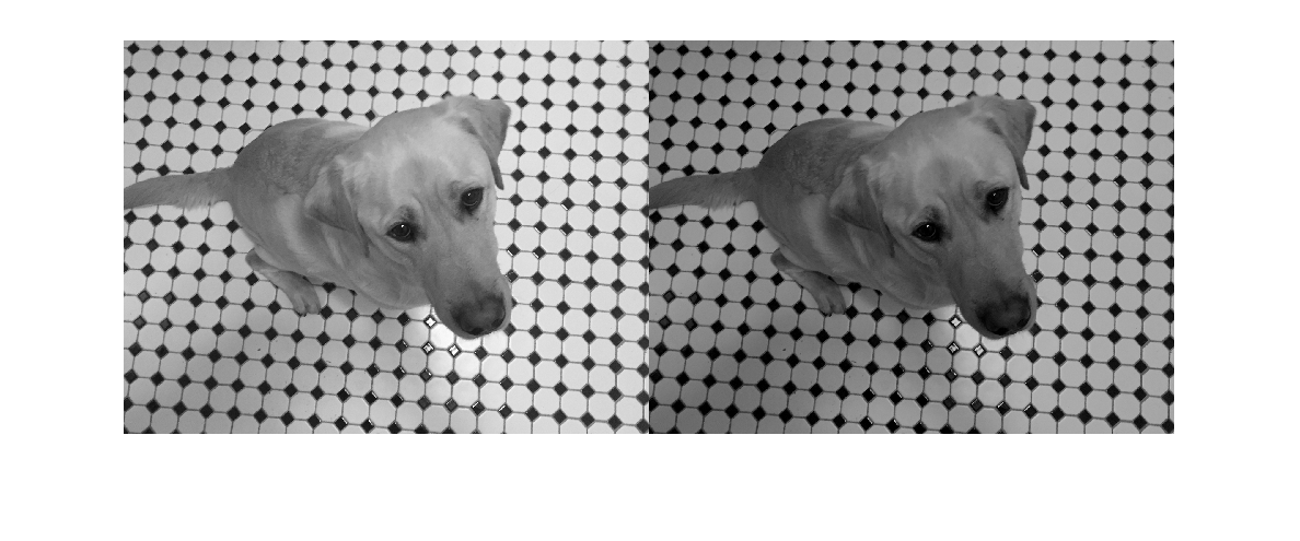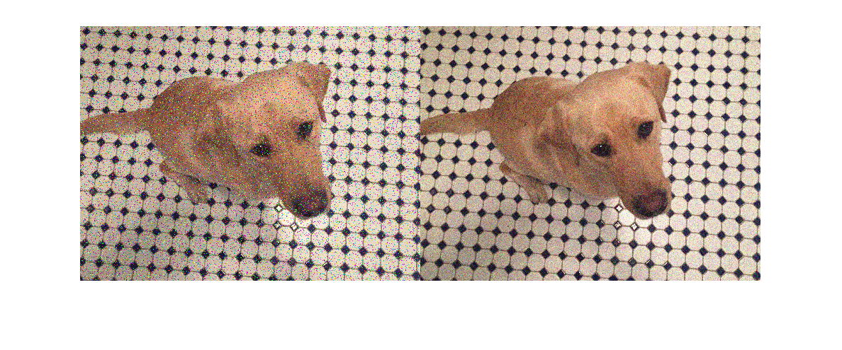 imSaltAndPepperNoise = imnoise(imOriginal,'salt & pepper',0.1); imGaussianNoise = imnoise(imOriginal,'gaussian'); montage({imSaltAndPepperNoise,imGaussianNoise})