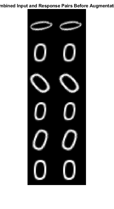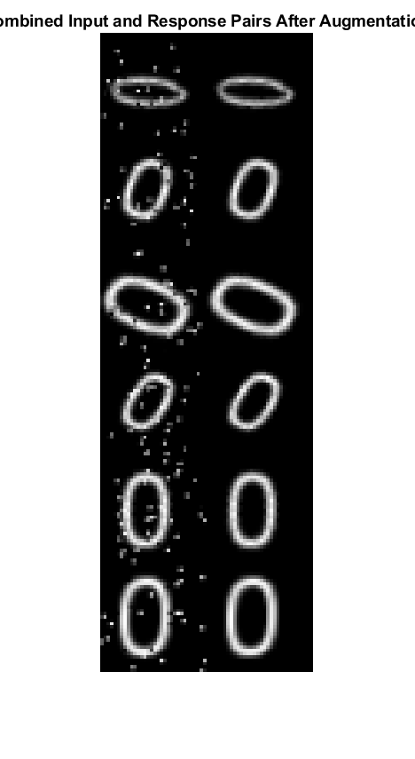 Увеличение изображений для регрессии от изображения к изображению более сложно, потому что необходимо применить идентичные геометрические преобразования к изображениям ответа и входу. Объединенные пары входа и ответа отображают при помощи combine функция. Преобразуйте одно или оба изображения в каждую пару при помощи transform функция.