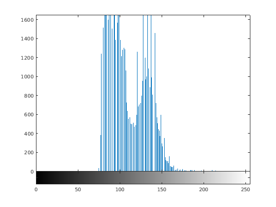 Просмотрите распределение интенсивности пикселя изображения. Изображение pout.tif несколько низкоконтрастное изображение. Чтобы видеть распределение интенсивности в изображении, создайте гистограмму путем вызова imhist функция. (Предшествуйте вызову imhist с командой figure так, чтобы гистограмма не перезаписывала отображение изображения I в окне текущей фигуры.) Уведомление, как гистограмма указывает, что область значений интенсивности изображения является довольно узкой. Область значений не покрывает потенциальную область значений [0, 255], и пропускает высокие и низкие значения, которые привели бы к хорошему контрасту.