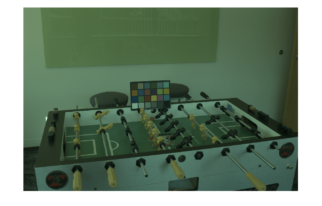 RAW = imread('foosballraw.tiff');Интерполируйте использование demosaic функция, чтобы получить цветное изображение. Диаграмма направленности антенной решетки цветового фильтра является RGGB.