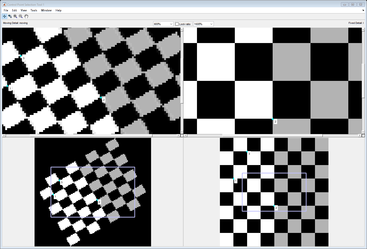 [ берет под свой контроль командную строку MATLAB, пока вы не закончили выбирать контрольные точки. Когда вы закончите выбирать контрольные точки, возвратитесь к рабочей области путем закрытия инструмента. selectedMovingPoints,selectedFixedPoints]