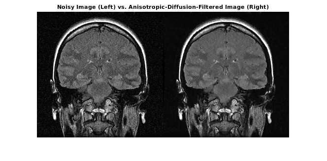 imshowpair(mristack(:,:,10),diffusedImage(:,:,10),'montage') title('Noisy Image (Left) vs. Anisotropic-Diffusion-Filtered Image (Right)')