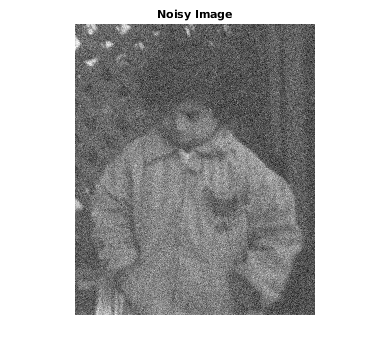 I = imread('pout.tif'); noisyImage = imnoise(I,'gaussian',0,0.005); imshow(noisyImage) title('Noisy Image')