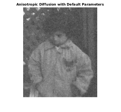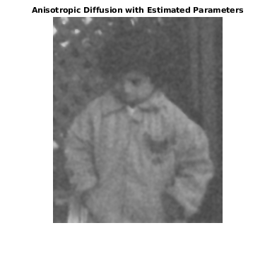[gradThresh,numIter] = imdiffuseest(noisyImage,'ConductionMethod','quadratic'); C = imdiffusefilt(noisyImage,'ConductionMethod','quadratic', ... 'GradientThreshold',gradThresh,'NumberOfIterations',numIter); imshow(C) title('Anisotropic Diffusion with Estimated Parameters')