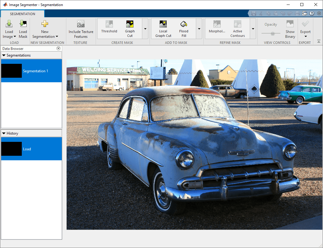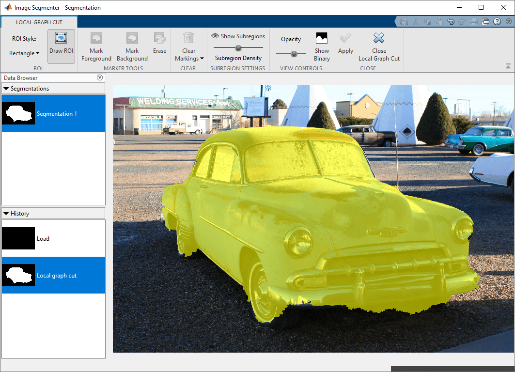 car = imread('car2.jpg');От MATLAB® Toolstrip откройте приложение Image Segmenter. На вкладке Apps, в разделе Image Processing и Computer Vision, нажимают Image Segmenter