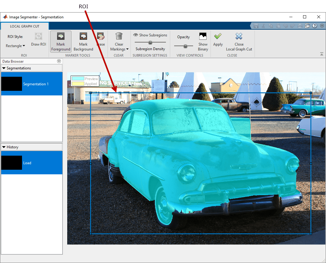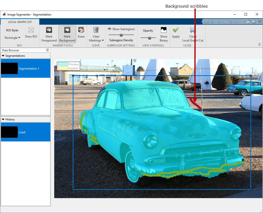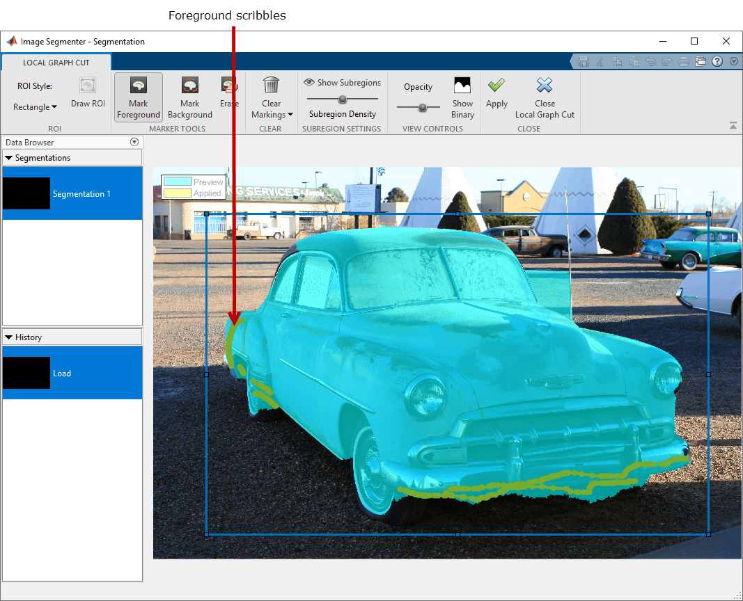 Чтобы совершенствовать автоматическую сегментацию, проведите линии (каракули), чтобы отметить любые части переднего плана, которые не были включены в автоматическую сегментацию. После того, как вы будете чертить ROI, Image Segmenter нажимает кнопку Mark Foreground автоматически.