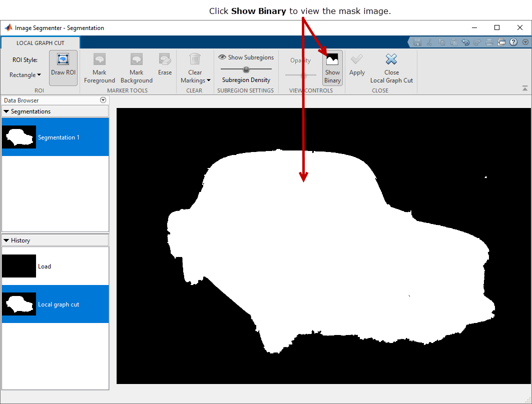 Чтобы просмотреть рисунок маски, нажмите Show Binary. Можно также просмотреть бинарный рисунок маски в основной вкладке Segmentation. Чтобы возвратиться к основному приложению Image Segmenter, нажмите Close Local Graph Cut.