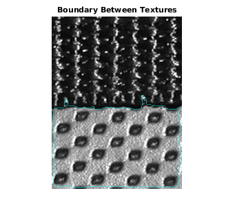 boundary = bwperim(mask); imshow(labeloverlay(I,boundary,"Colormap",[0 1 1])) title('Boundary Between Textures')