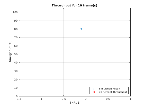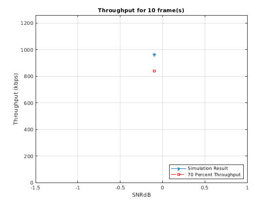 Пример выполняется в течение продолжительности симуляции 10 систем координат в ОСШ-0.1 дБ согласно TS 36.104, Таблице 8.2.1.1-7 [1]. Большое количество NFrames должен использоваться, чтобы привести к значимым результатам пропускной способности. SNRIn может быть массив значений или скаляра.