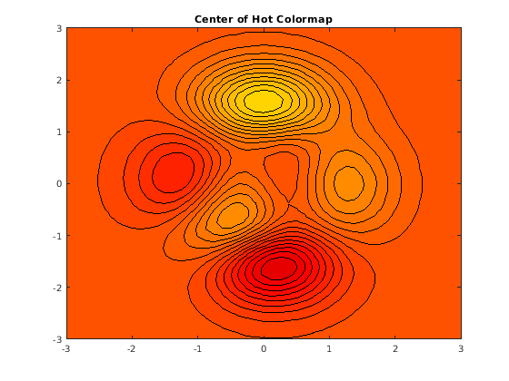 Используйте только цвета в центре hot палитра путем установки цветной оси, масштабирующейся к области значений, намного больше, чем область значений значений в матричном Z. caxis функционируйте управляет отображением значений данных в палитру. Используйте эту функцию, чтобы установить цветное масштабирование оси.