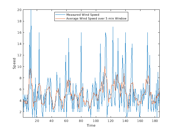 load windData.mat mins = 1:length(speed); window = 5; meanspeed = movmean(speed,window); plot(mins,speed,mins,meanspeed) axis tight legend('Measured Wind Speed','Average Wind Speed over 5 min Window','location','best') xlabel('Time') ylabel('Speed')