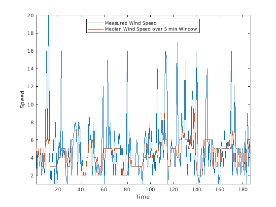 medianspeed = movmedian(speed,window); plot(mins,speed,mins,medianspeed) axis tight legend('Measured Wind Speed','Median Wind Speed over 5 min Window','location','best') xlabel('Time') ylabel('Speed')