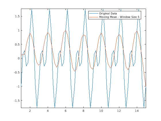 window = 3; Amean = movmean(Anoise,window); plot(t,A,t,Amean) axis tight legend('Original Data','Moving Mean - Window Size 3')