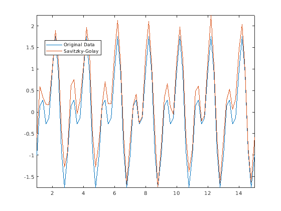 [Asgolay,window] = smoothdata(Anoise,'sgolay'); plot(t,A,t,Asgolay) axis tight legend('Original Data','Savitzky-Golay','location','best')