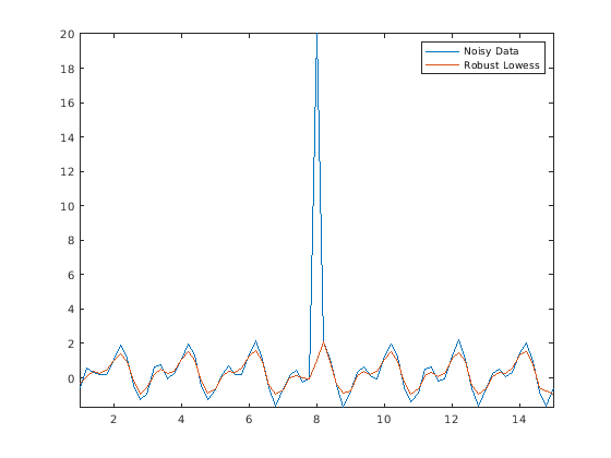 Устойчивый метод Lowess является другим методом сглаживания, который особенно полезен, когда выбросы присутствуют в данных в дополнение к шуму. Введите выброс в зашумленные данные и используйте устойчивый Lowess, чтобы сглаживать данные, которые устраняют выброс.