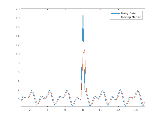 Amedian = smoothdata(Anoise,'movmedian'); plot(t,Anoise,t,Amedian) axis tight legend('Noisy Data','Moving Median')