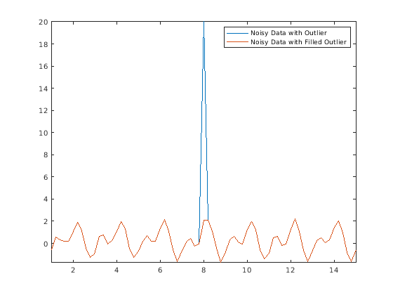 Afill = filloutliers(Anoise,'next'); plot(t,Anoise,t,Afill) axis tight legend('Noisy Data with Outlier','Noisy Data with Filled Outlier')