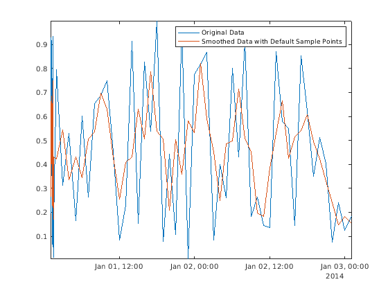 Asamplepoints = smoothdata(Airreg,'movmean',hours(3),'SamplePoints',time); plot(time,Airreg,time,Asamplepoints) axis tight legend('Original Data','Smoothed Data with Sample Points')