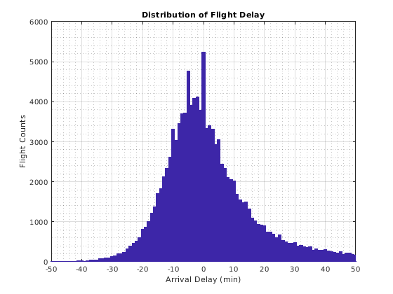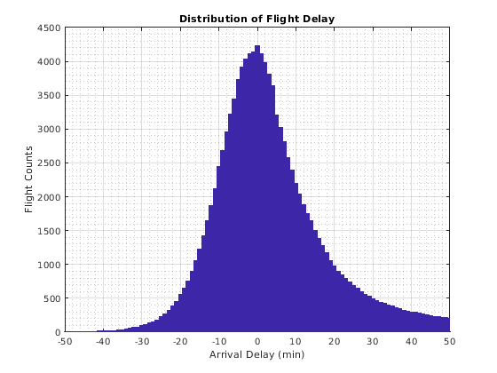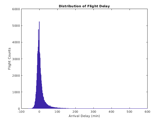 bar(edges, counts, 'hist'); title('Distribution of Flight Delay') xlabel('Arrival Delay (min)') ylabel('Flight Counts')