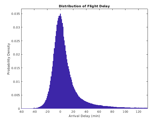 empiricalCDF = cumsum(counts); empiricalCDF = empiricalCDF / empiricalCDF(end); quartile99 = find(empiricalCDF>0.99, 1, 'first'); low99 = 1:quartile99; figure empiricalPDF = smoothCounts(low99) / sum(smoothCounts); bar(edges(low99), empiricalPDF, 'hist'); xlim([-60,edges(quartile99)]); ylim([0, max(empiricalPDF)*1.05]); title('Distribution of Flight Delay') xlabel('Arrival Delay (min)') ylabel('Probability Density')