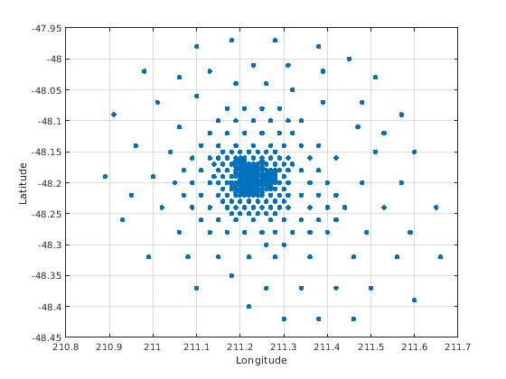 load seamount plot(x,y,'.','markersize',12) xlabel('Longitude'), ylabel('Latitude') grid on