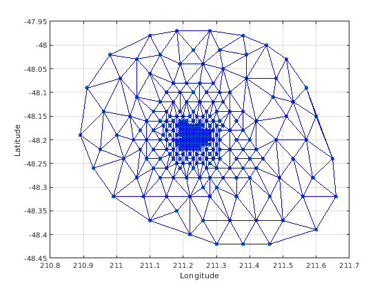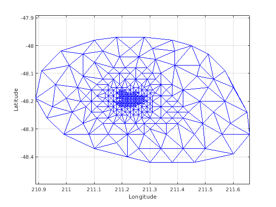 triplot(DT); axis equal xlabel('Longitude'), ylabel('Latitude') grid on