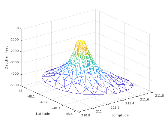 figure hidden on trimesh(tri,x,y,z) xlabel('Longitude'),ylabel('Latitude'),zlabel('Depth in Feet');