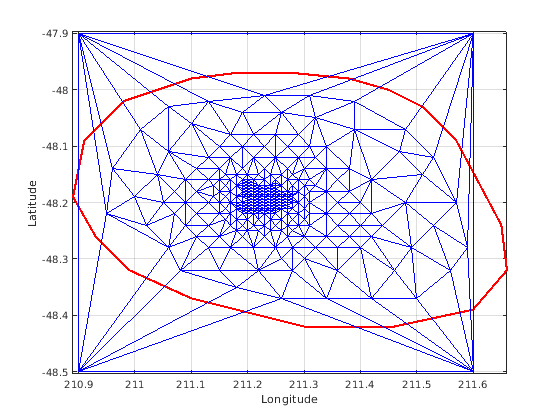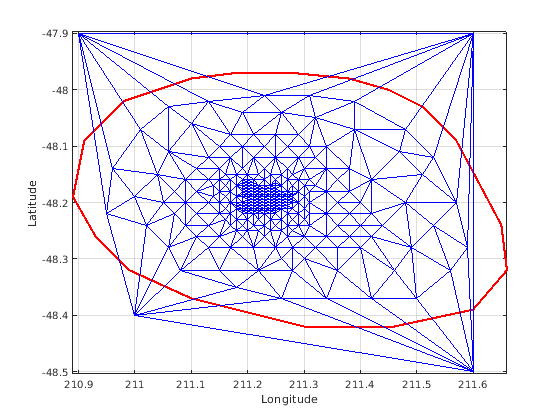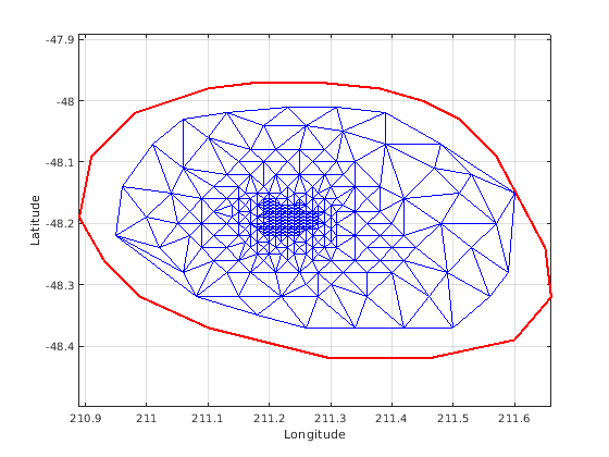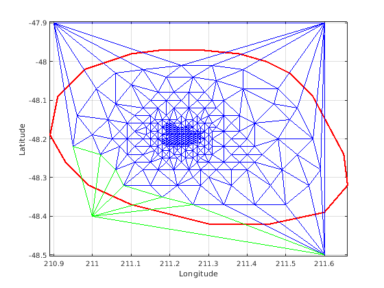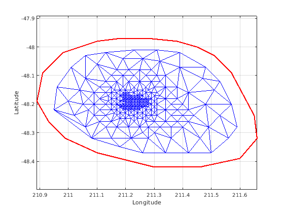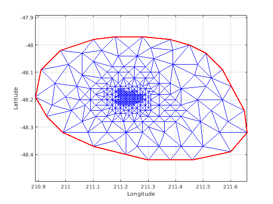 figure plot(xHull,yHull,'r','LineWidth',2); axis equal xlabel('Longitude'),ylabel('Latitude') grid on hold on triplot(DT); hold off