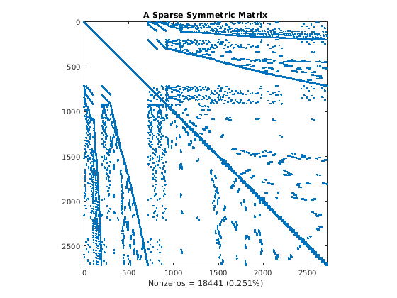 load barbellgraph.mat S = A + speye(size(A)); pct = 100 / numel(A); spy(S) title('A Sparse Symmetric Matrix') nz = nnz(S); xlabel(sprintf('Nonzeros = %d (%.3f%%)',nz,nz*pct));