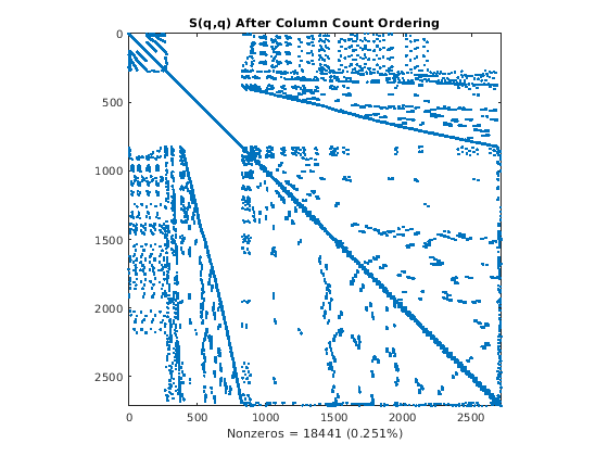 q = colperm(S); spy(S(q,q)) title('S(q,q) After Column Count Ordering') nz = nnz(S); xlabel(sprintf('Nonzeros = %d (%.3f%%)',nz,nz*pct));