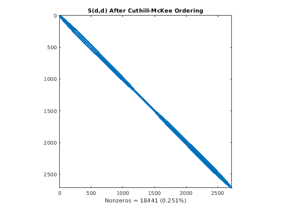 d = symrcm(S); spy(S(d,d)) title('S(d,d) After Cuthill-McKee Ordering') nz = nnz(S); xlabel(sprintf('Nonzeros = %d (%.3f%%)',nz,nz*pct));