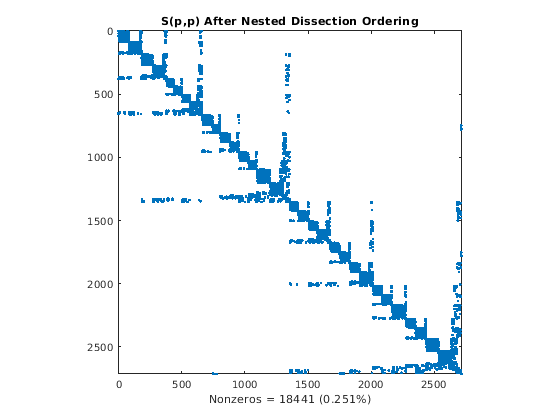 p = dissect(S); spy(S(p,p)) title('S(p,p) After Nested Dissection Ordering') nz = nnz(S); xlabel(sprintf('Nonzeros = %d (%.3f%%)',nz,nz*pct));