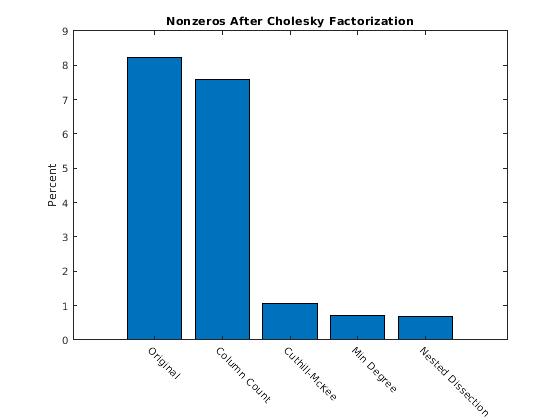 Эта столбчатая диаграмма обобщает эффекты переупорядочения матрицы прежде, чем выполнить факторизацию Холесского. В то время как факторизация Холесского исходной матрицы имела приблизительно 8% своих элементов как ненули, с помощью dissect или symamd уменьшает ту плотность меньше чем до 1%.