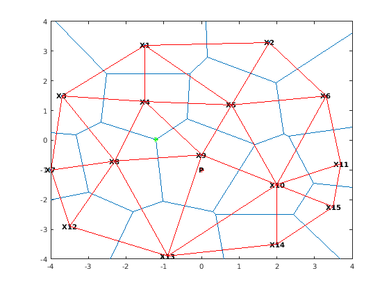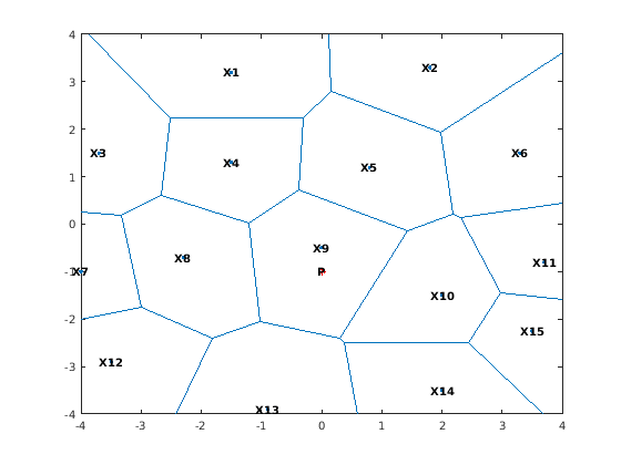 figure() X = [-1.5 3.2; 1.8 3.3; -3.7 1.5; -1.5 1.3; ... 0.8 1.2; 3.3 1.5; -4.0 -1.0;-2.3 -0.7; ... 0 -0.5; 2.0 -1.5; 3.7 -0.8; -3.5 -2.9; ... -0.9 -3.9; 2.0 -3.5; 3.5 -2.25]; voronoi(X(:,1),X(:,2)) % Assign labels to the points. nump = size(X,1); plabels = arrayfun(@(n) {sprintf('X%d', n)}, (1:nump)'); hold on Hpl = text(X(:,1), X(:,2), plabels, 'FontWeight', ... 'bold', 'HorizontalAlignment','center', ... 'BackgroundColor', 'none'); % Add a query point, P, at (0, -1.5). P = [0 -1]; plot(P(1),P(2), '*r'); text(P(1), P(2), 'P', 'FontWeight', 'bold', ... 'HorizontalAlignment','center', ... 'BackgroundColor', 'none'); hold off