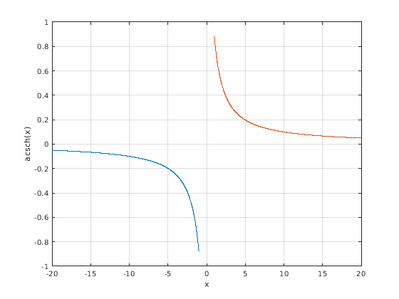 Y = acsch(X) возвращает обратный гиперболический косеканс элементов X. Функция принимает и действительные и комплексные входные параметры. Все углы исчисляются в радианах.