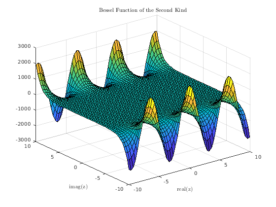 x = -10:0.35:10; y = x'; z = x + 1i*y; scale = 1; Y = bessely(2,z); Ys = bessely(2,z,scale);