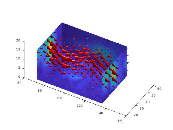 coneplot(...,color) интерполирует массив color на векторное поле и затем окрашивает конусы согласно интерполированным значениям. Размер color массив должен быть одного размера с UVW массивы. Эта опция работает только с конусами (то есть, не с quiver опция).