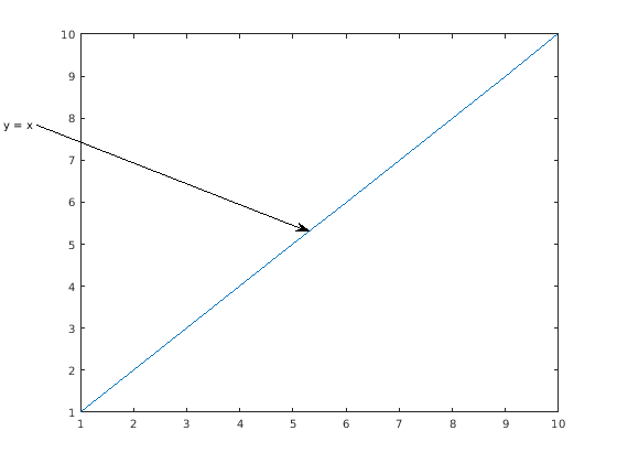 plot(1:10) annotation('textarrow',[0.06 0.5],[0.73 0.5],'String','y = x ') f = gcf; copygraphics(f)