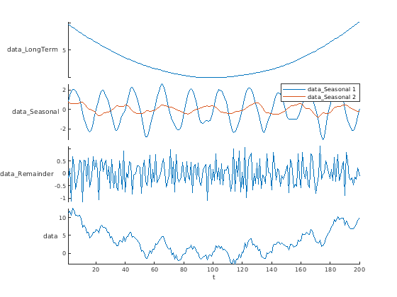 находит тренды в таблице или расписании данных с помощью SSA. D = trenddecomp(T)trenddecomp работает с каждой табличной переменной отдельно. D таблица или расписание, переменные которого содержат долгосрочный тренд, сезонные тренды и остаток для каждой переменной. trenddecomp возвращает несколько сезонных трендов как одну переменную в D, чьи столбцы содержат каждый сезонный тренд.