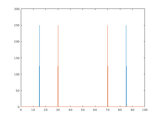 plot(fshift,powershift(1,:),fshift,powershift(2,:))