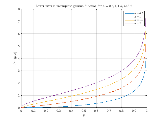 X = gammaincinv( возвращает инверсию более низкой неполной гамма функции, выполненной в элементах Y,A)Y и A, таким образом, что Y = gammainc(X,A). Оба Y и A mustBeReal. Элементы Y должен быть в закрытом интервале [0,1] и A mustBeNonnegative.